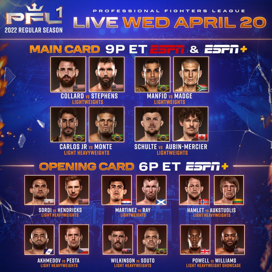 The start times for the event are as follows. June 15 2022 930 am ET. Heres the fight card for the PFL playoffs with the latest odds from Caesars Sportsbook.